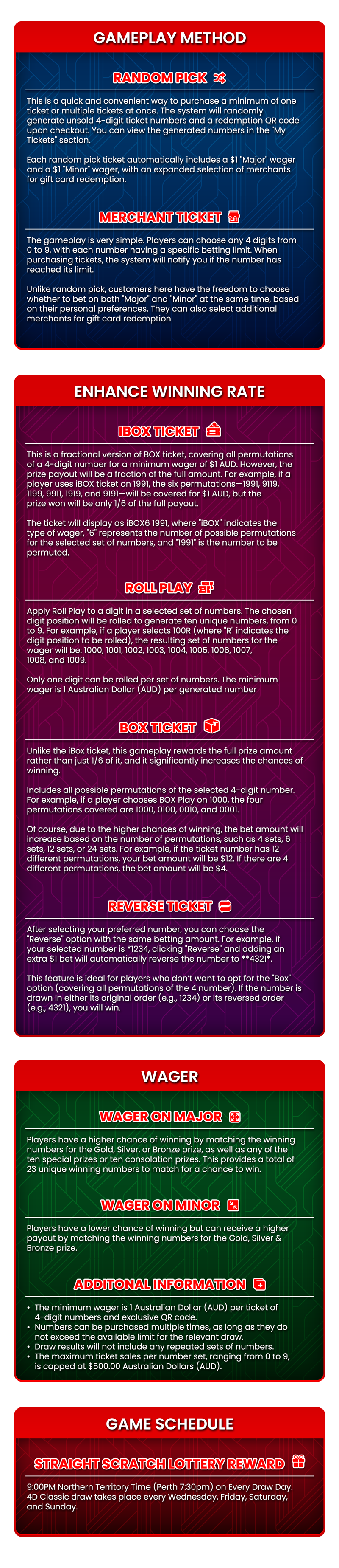 Copyright © 2024 OZ4D LOTTERY AUSTRALIA PTY LTD, ABN 87 680 386 403 | Lottery Permit (ACT): TP 25/02520 | All Rights Reserved | Privacy Policy | Disclaimer & Terms of Usage | Legal Notice